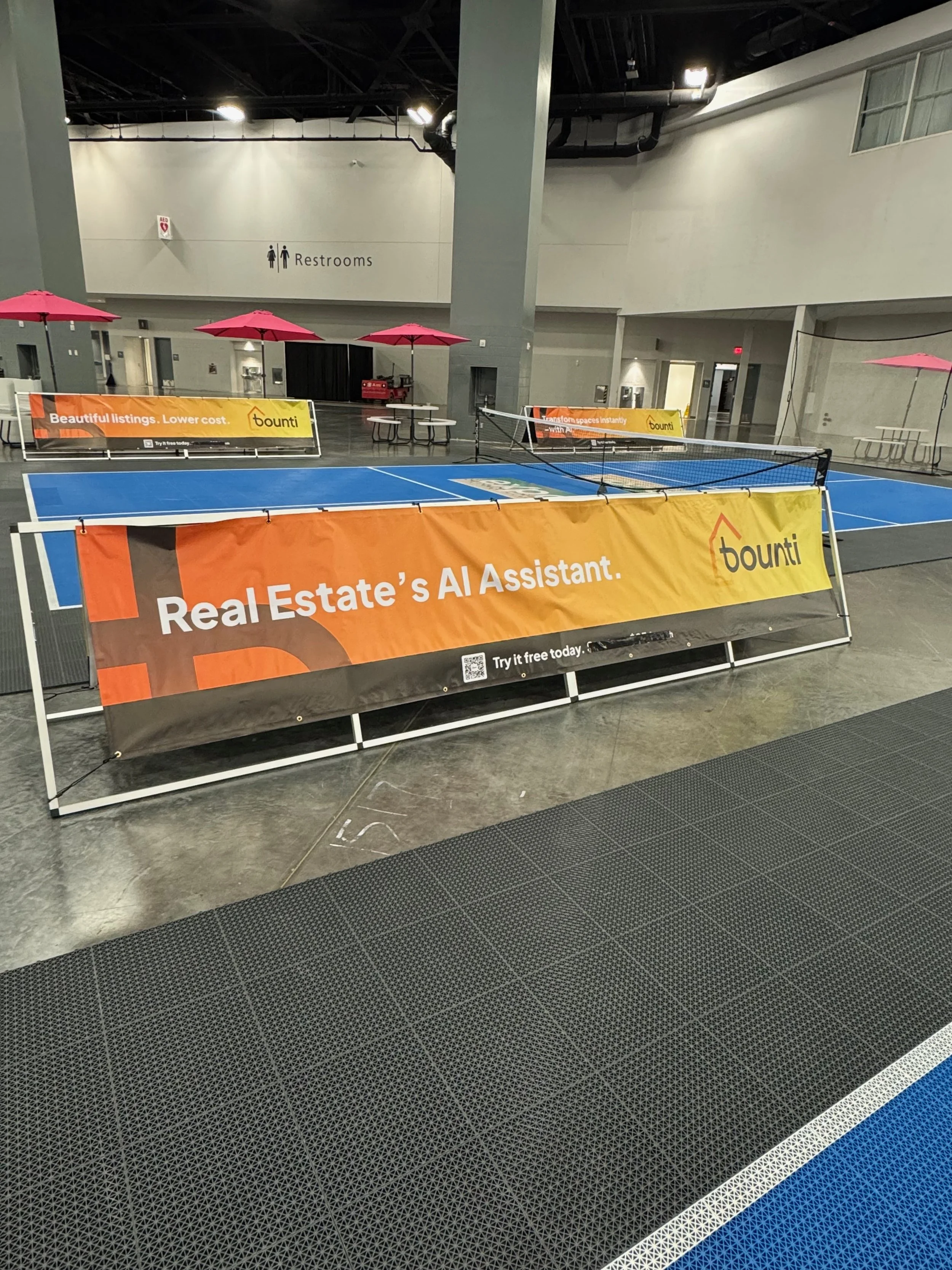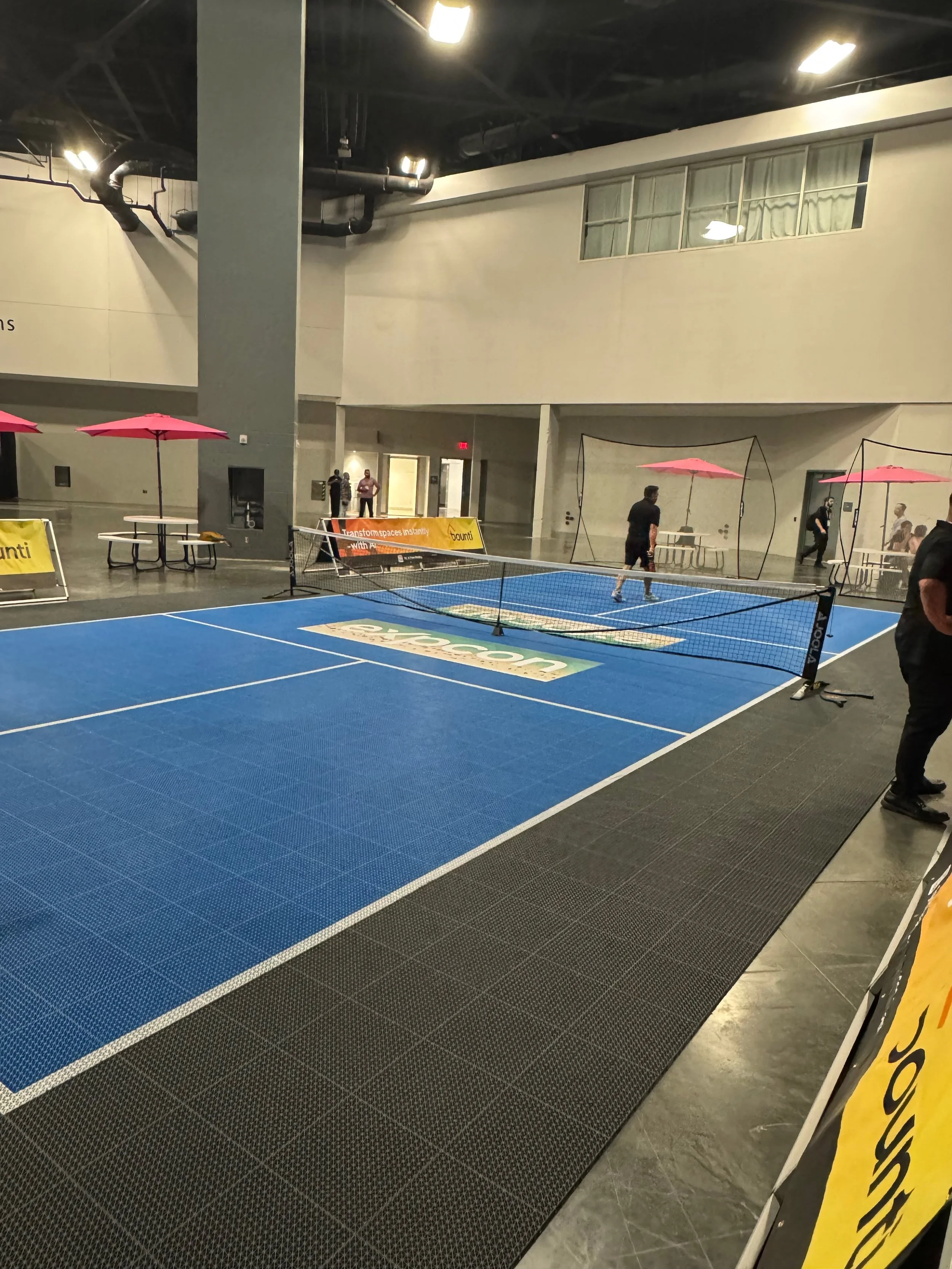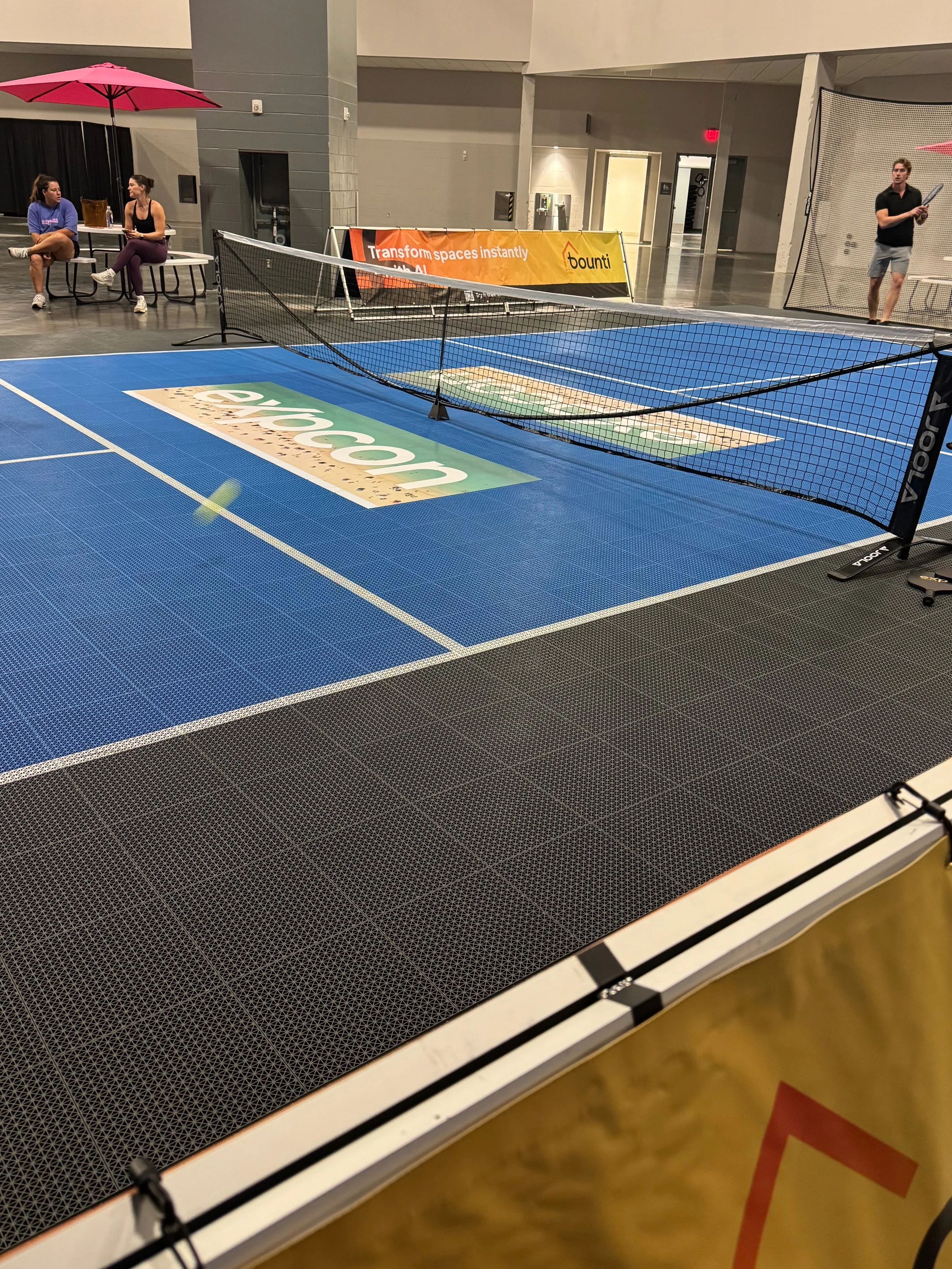 Pickleball Pop-Ups supplied two pickleball courts in the expo hall with branded barriers and court graphics. Our pickleball staff hosted open play sessions for two days during the expo hall hours, and attendees enjoyed an evening reception featuring the pickleball courts as well.